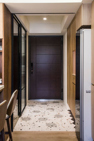 •玄關區以深色門搭配幾何花磚,界定出入門動線,呈現簡潔俐落的第一印象。