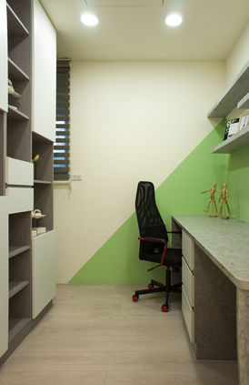 男孩房則透過藍色小熊圖騰為牆面定調,搭配灰階層板與自然木色書桌,創造趣味與實用兼具的成長角落。